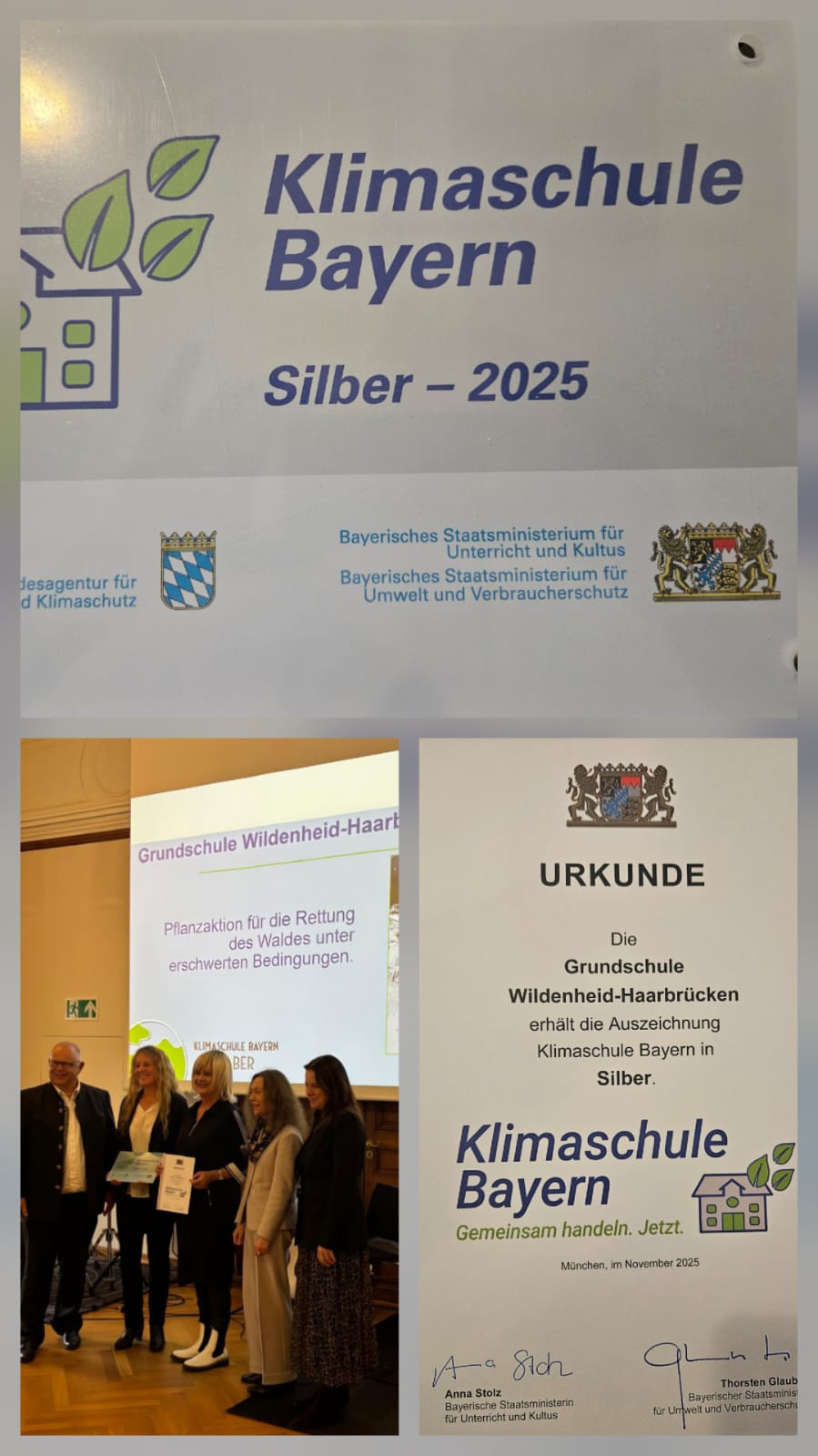 Mit großer Freude dürfen wir bekanntgeben, dass unsere Schule heute die Auszeichnung „Klimaschule in Silber“ erhalten hat. Diese Würdigung ist ein bedeutendes Zeichen für unser gemeinsames Engagement, Verantwortung für unsere Umwelt zu übernehmen und nachhaltiges Handeln fest in unserem Schulalltag zu verankern.