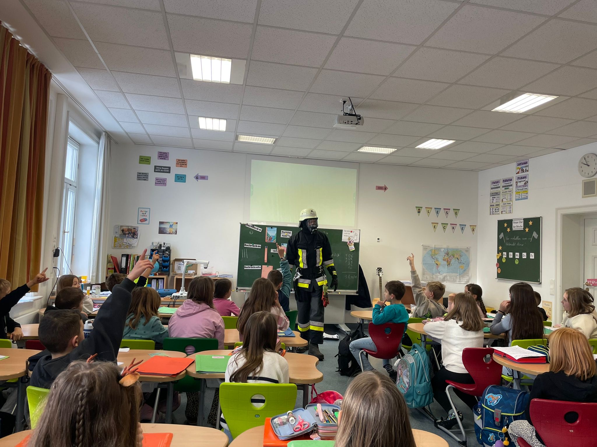 Beim aktuellen Thema Feuer behandeln die Drittklässler auch die Feuerwehr. Herr Stauch konnte den Schülerinnen und Schülern seine eigene Ausrüstung zeigen und viele Fragen der Kinder beantworten. Natürlich durften sie danach auch alles einmal anprobieren. Vielleicht sind das ja die Feuerwehrmänner und -frauen von morgen?!
