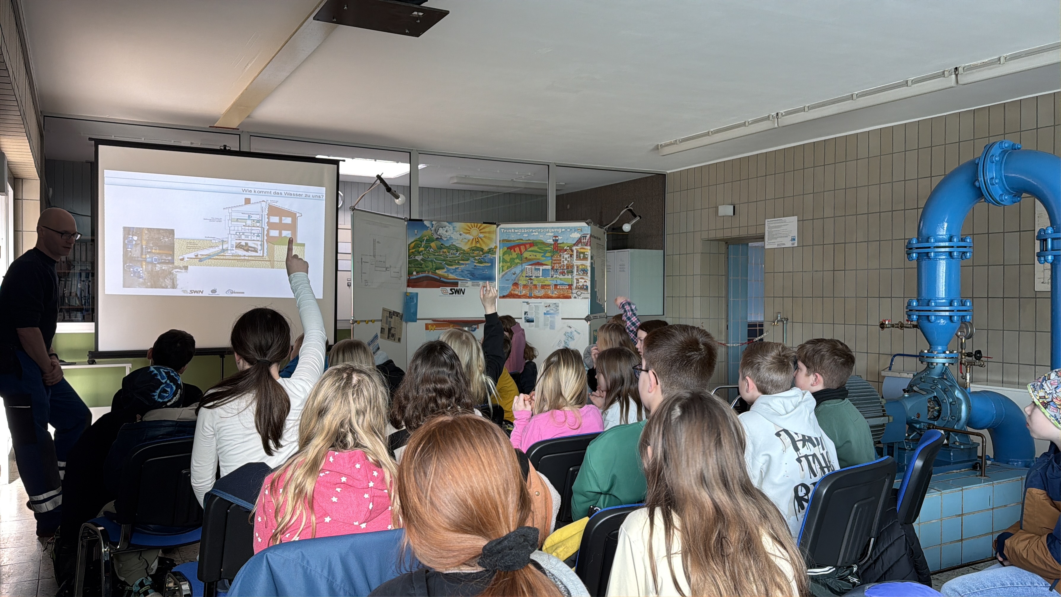 Mit Interesse verfolgten die Mädchen und Jungen die einzelnen Schritte der Reinigung und erfuhren, wie wichtig sauberes Wasser für unseren Alltag ist. Unterstützt von Herrn Walter durften sie schließlich sogar einen Blick auf das fertig aufbereitete Wasser werfen – genau das Wasser, das sie vermutlich schon am nächsten Morgen ganz selbstverständlich aus ihrem Wasserhahn zu Hause entnehmen.
